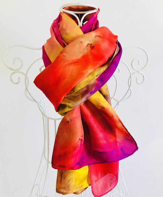 Écharpe en 100% soie peinte à la main, ointe d’huile de Jérusalem. D’un confort et d’une douceur incomparable. A offrir ou à s’offrir pour porter les couleurs du Royaume, le Salut et la Guérison acquis pour nous à La Croix.