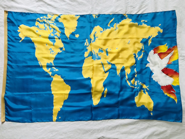 Bannière en soie épaisse, peinte à la main, ointe d’huile de Jérusalem. Drapeau de proclamation. La Colombe en Feu apportant le Réveil sur les Nations du Monde.