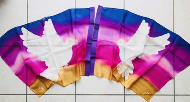 Bannière en 100% soie légère, peinte à la main et ointe d’huile de Jérusalem . D’une fluidité exemplaire, elle voltige dans l’air et capte la grâce du Saint-Esprit. Pour le plaisir des jeunes et des plus grands 😊.