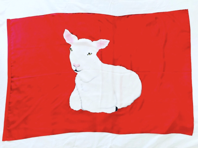 Banniere en soie épaisse, peinte à la main, ointe d’huile de Jérusalem. Drapeau de proclamation. L’Agneau sans tâche a été immolé pour nos péchés. Lui juste pour des injustes.